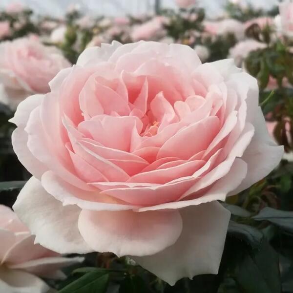 Nydelig kompakt buskrose med blomster som er fylte, lys rosa med mørkere i midten, remonterende blomstring fra juni til oktober. Lett duft.