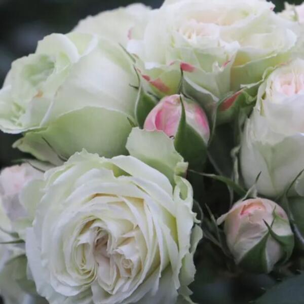 Nydelig buskrose med nydelige kompakte fylte blomster i hvitt med rosa sjatteringer farge med en lett duft.